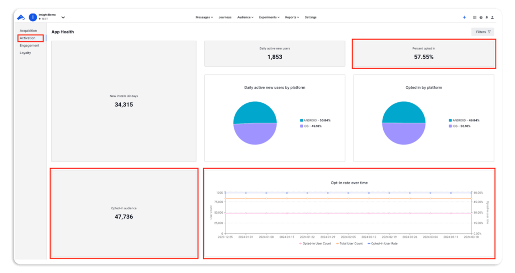 Le Tableau de bord sur la santé de l’app est un excellent point de départ pour identifier des opportunités. Avec notre Centre de Préférence et à notre Hub d’Expérimentation, vous disposez de la meilleure suite d’outils pour générer de l’opt-in sur tous les canaux, accroître votre portée et optimiser les performances de vos messages.